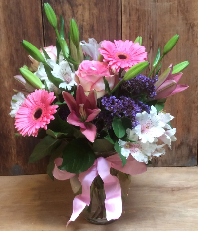 Send someone on a stroll through an enchanting English garden with this charming country-style arrangement. Featuring delicate textures and feminine flowers in soft pinks, it exudes a shabby chic appeal. The bouquet includes roses, lilies, alstroemeria, and gerbera, arranged in a traditional airy style with height. Presented in a clear glass ginger vase adorned with a French ribbon bow, this lush arrangement stands approximately 15" tall, perfect for creating a captivating ambiance.